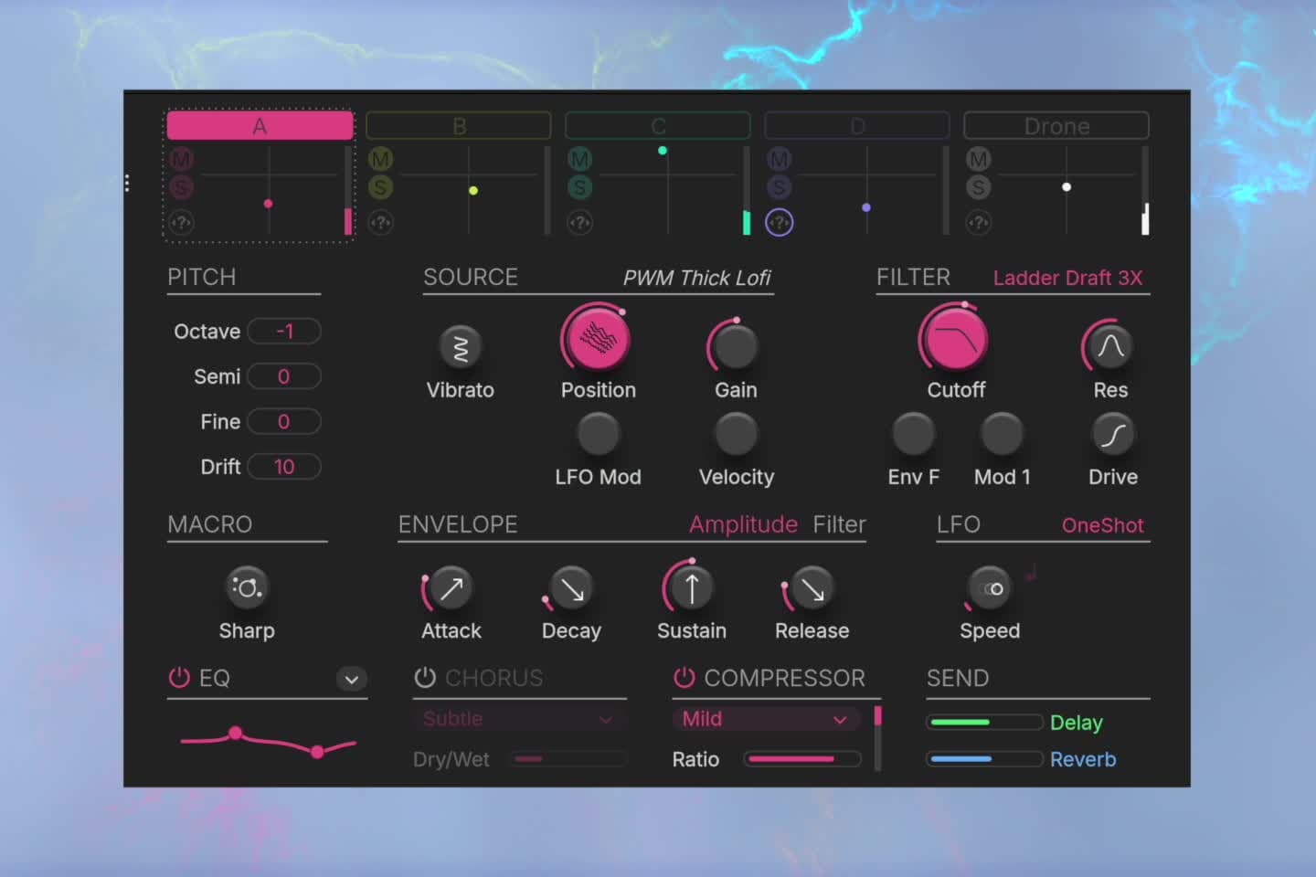 Pick a preset and take control. Shape patterns, chords, layers, filters, envelopes, pitch, modulation and FX. Use this powerful selection of tools to discover your own sound.