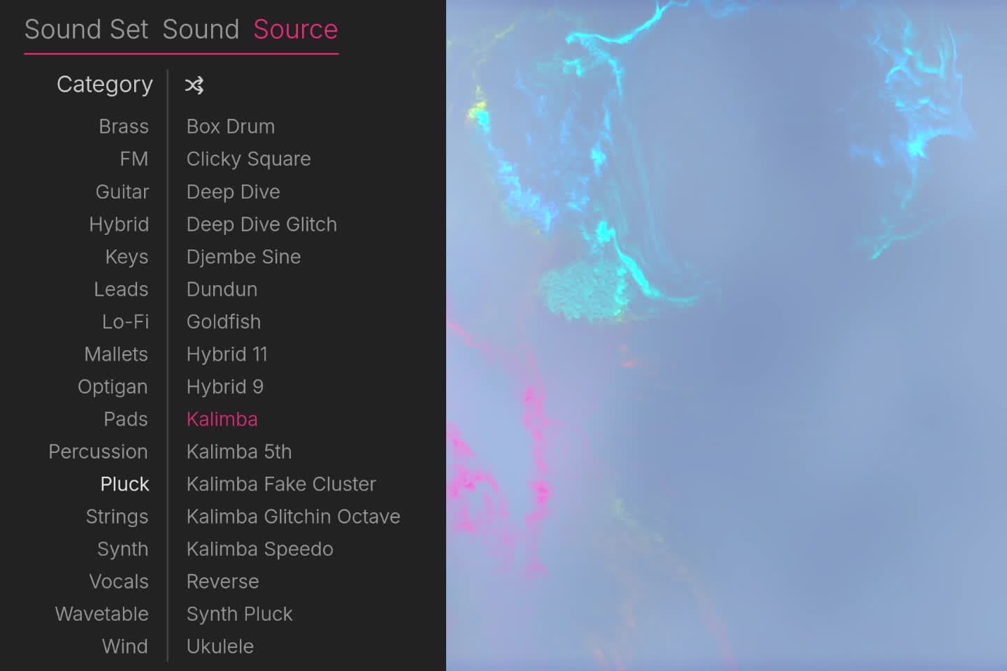 The Perform View allows you to get a quick overview of the entire instrument. Instantly tweak sound layer controls, macros, pattern speed, and Half Time FX—while shader liquids flow in sync with your sound.